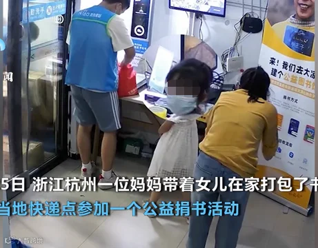 8月25日,杭州某快递点内,一个身穿白色公主裙的小女孩,一蹦一跳地走了进来,妈妈紧跟其后,母女二人前来是捐赠图书的。