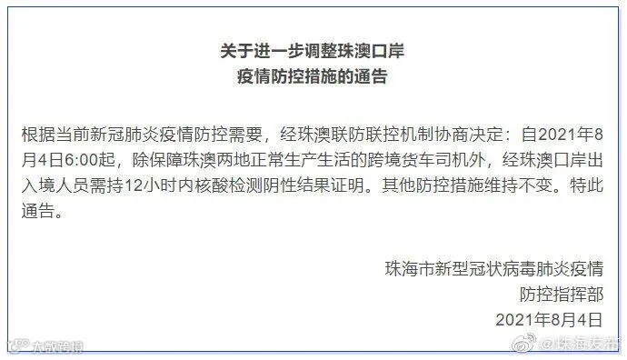 自2021年8月4日6:00起,除保障珠澳两地正常生产生活的跨境货车司机外,经珠澳口岸出入境人员需持12小时内核酸检测阴性结果证明。