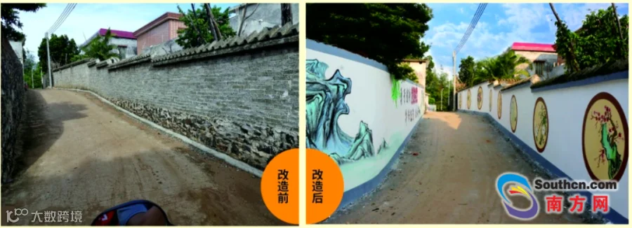 那毛村主干道围墙墙体采用当地的乌石材料进行修复,彰显了当地特色,加上三角梅、勒杜鹃等绿化美化,相互辉映。而且,那毛村墙绘工程呈现了雷剧文化、编织艺术、渔村海滨风情,别具特色,一改曾经破败的面貌。