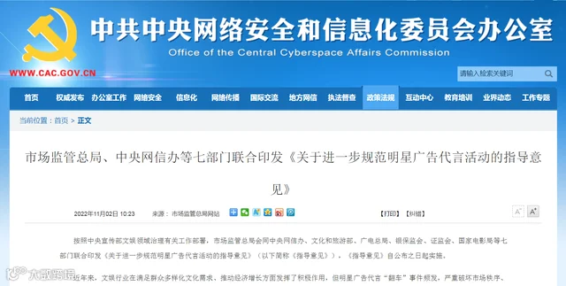 2022年10月31日,市场监管总局会同中央网信办、文化和旅游部、广电总局、银保监会、证监会、国家电影局等七部门联合印发《关于进一步规范明星广告代言