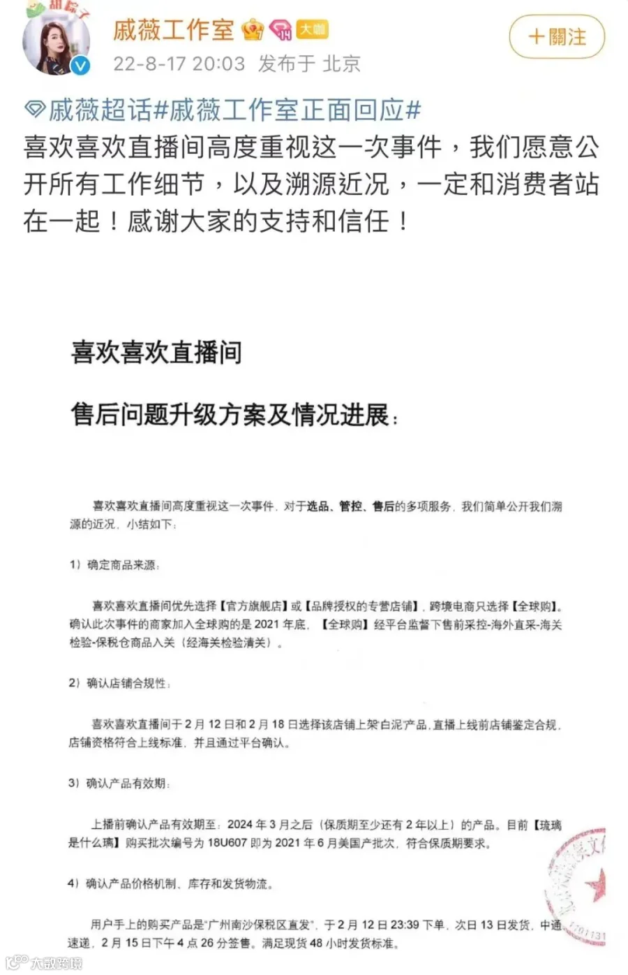 戚薇工作室发文否认卖假货