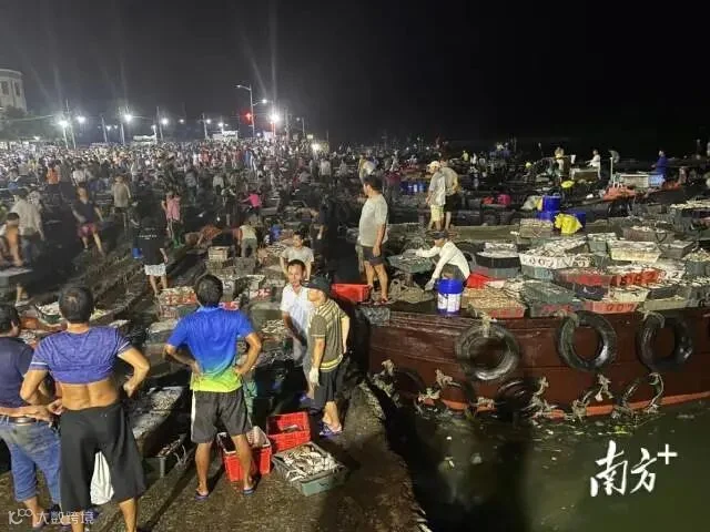 河道上,渔船列成一字纵队,蹒跚前行,满舱的鱼虾狠狠地压低了吃水线;码头边,灯火通明,一筐筐海鲜从船上源源不断地卸到广场,等候已久的各地客商一拥而上,激烈抢购。
