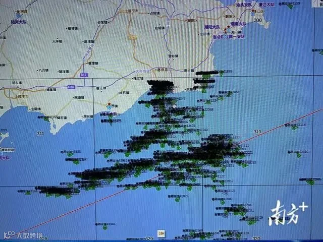 8月18日23时,记者在广东省渔政总队惠来大队办公楼的广东省海洋综合执法指挥系统显示屏上看到,惠来周边海域黑压压的一片,全是一个个箭头和编号。