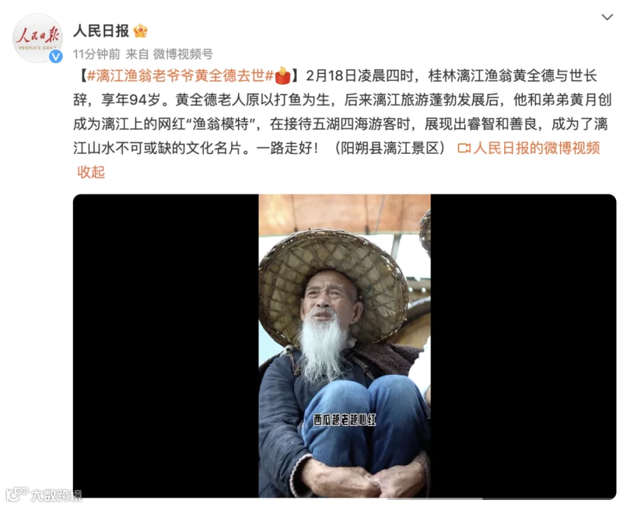 2月18日14时50分,阳朔县漓江风景区发布信息称,黄全德老爷爷于18日凌晨长眠,享年94岁。渔翁老爷爷是漓江文学底蕴的代表,他是一个和蔼可亲,热爱生活的人。后辈也会学习他的品格和毅力,从他手中接过接力棒,传承漓江精神。