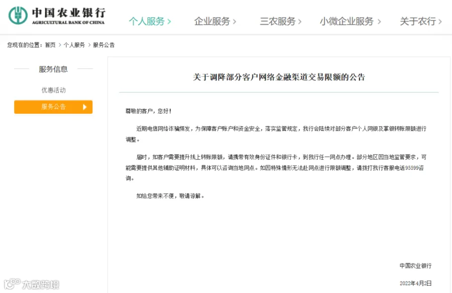 客服称,目前尚未出现客户反映非柜面交易额度下调的情况。