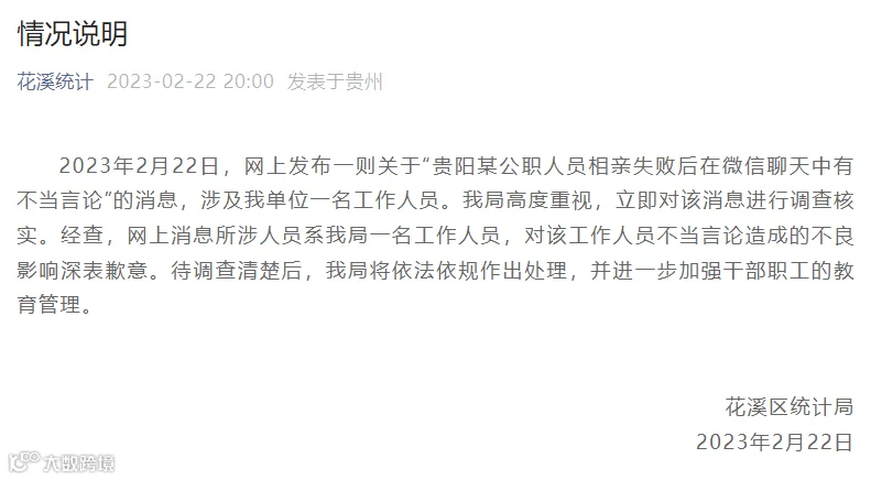 2023年2月22日,网上发布一则关于“贵阳某公职人员相亲失败后在微信聊天中有不当言论”的消息,涉及我单位一名工作人员。我局高度重视,立即对该消息进行调查核实。经查,
