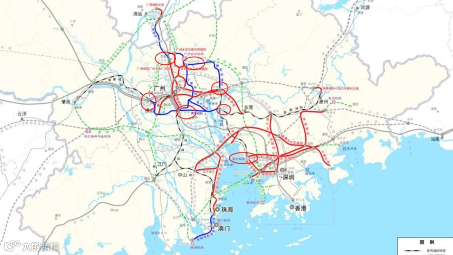 广东省也将广州都市圈和深圳都市圈定位大湾区内地城际轨道的中心,由广州和深圳牵头推进城际轨道修建工作。