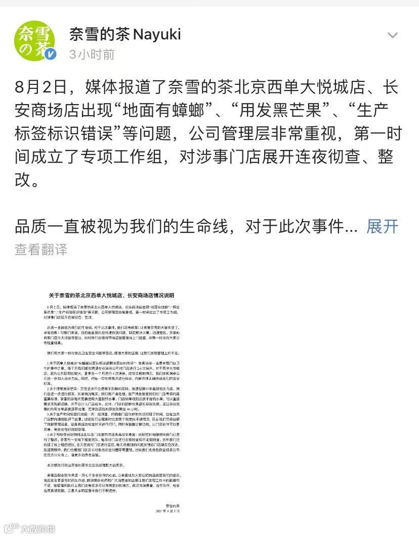 8月3日,奈雪的茶官方微博发布情况说明,对于此次事件深表歉意,并表示涉事的两家门店暂停营业。