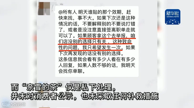 奈雪饮品“霸气柠檬油柑”保质期只有一天,但在“奈雪的茶”北京西单大悦城店,生产标签为手工输入。因操作失误,出现过工作人员错将当天该品生产日期打成前一天的情况。直到晚上闭店时,店长才发现。工作人员在群中私下处理了此事,相关情况并未对消费者公示,也未采取任何补救措施。