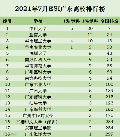 近日,科睿唯安公布了2021年7月ESI的最新统计数据,广东18所高校116个学科进入全球排名前1%,入榜学科数居全国第四位;10所高校闯入“全国百强”,实现历史最好成绩。