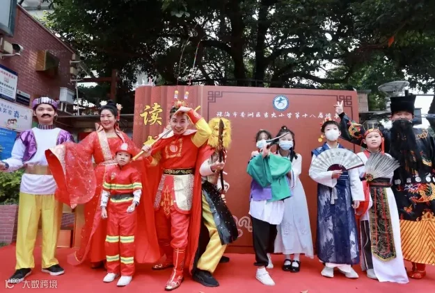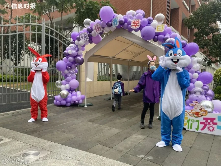 清华附中湾区学校举行温馨有爱的欢迎仪式:吉祥物兔宝宝(人偶、五育并举可爱兔)校门迎新,岭南文化舞狮表演,清华元素气球拱门装点校门,节日气氛浓厚。