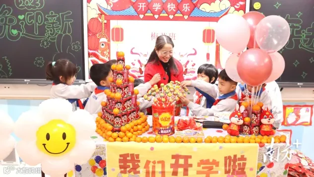 中山市三鑫凯茵学校处处挂着各种喜庆的祝福语,欢迎着孩子们返校。桌子上摆着醒狮、大葱、苹果、桔子等各式各样的果蔬,寓意孩子们“平安喜乐”“聪明伶俐”“大吉大利”。大鼓寓意“一鸣惊人”,表达着老师们对孩子们深深的祝福。孩子们洋溢着对新学期的憧憬,摸一摸水果,沾一沾喜气,被这份仪式感满满的小惊喜深深吸引。