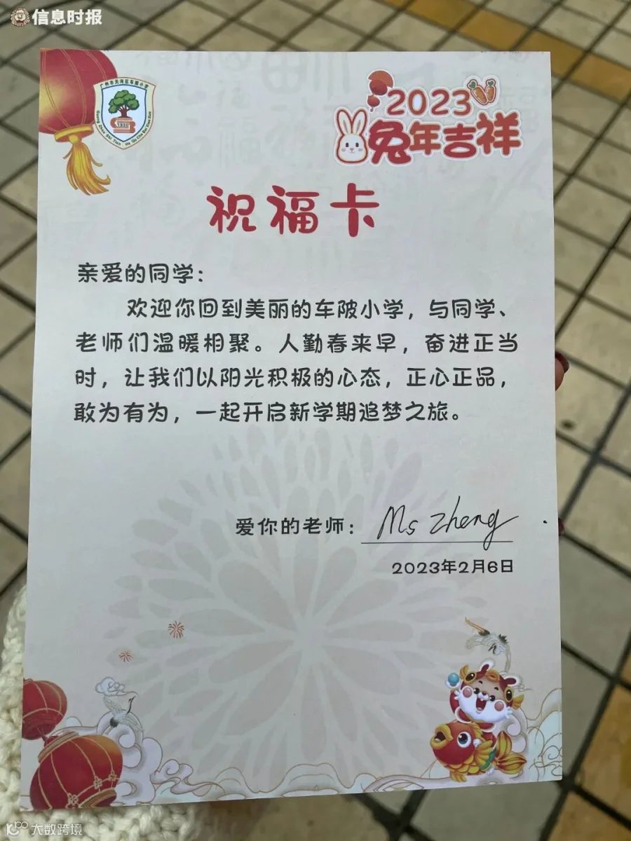 校门口,学校领导和老师们在两旁迎接每一位返校的同学,并送上“祝福卡”。祝福卡正面是欢迎同学们回校的祝福语,背面则是立志卡,同学们可以在新学期伊始填写“我的目标”和“我的行为”,在崭新的学期立下新期望。