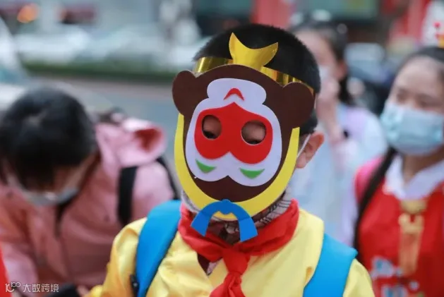 东风东路小学,戴上兔年特色头罩返学的学生。