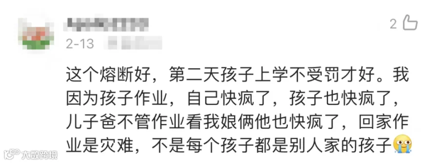 江苏省南京市北京东路小学设置了两个“熔断机制”,晚上9点后,如果三到六年级学生还有家庭作业没有完成,家长可以申请免做;如果语数英三门作业超过一个小时没做完,家长可以根据孩子情况申请免做。