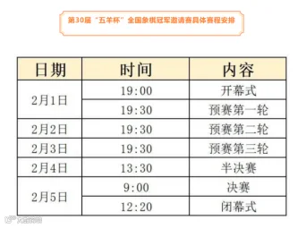 第30届“五羊杯”全国象棋冠军邀请赛将于2023年2月1日至2月5日在广州文化公园举行。赛事将分为小组预赛、半决赛和决赛三个阶段进行。