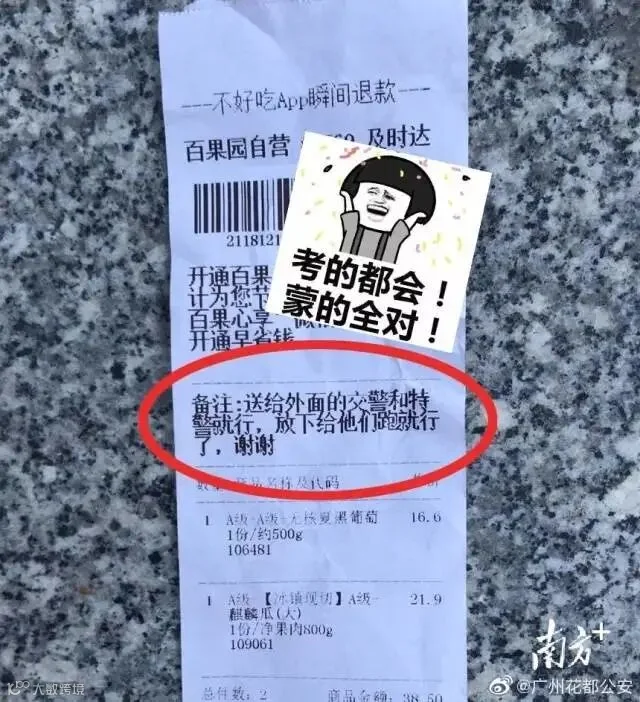这份温暖,是一份份甜甜的水果。 “送给外面的交警和特警就行,放下给他们跑就行。”看到考场外的民警备受“烤”验,广州市花都区实验中学的考生请外卖小哥送上水果;广州增城新塘中学外的交警,也收到满满一警帽的苹果。果甜,心更甜。