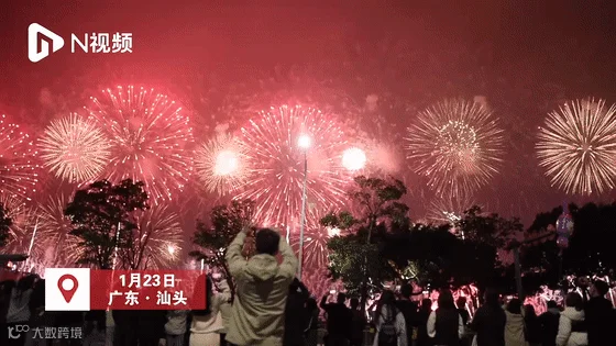 高空烟花、中空烟花、水面烟花等各式烟花在空中缤纷绽放,科技感十足的无人机编排成多种图案,让汕头更显流光溢彩、绚烂夺目。23日晚8时,在内海湾粮食码头对开海面,汕头举行迎春大型焰火晚会。在市民的一声声欢呼中,无数烟花冲上苍穹。
