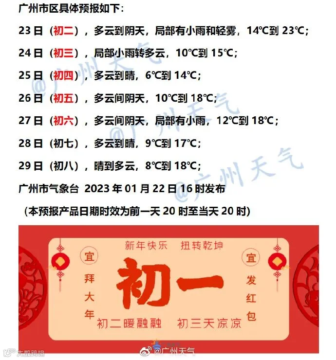 初二到初四有中等强度冷空气影响(冷空气初二傍晚前后到达广州),日平均气温下降4℃~6℃; -