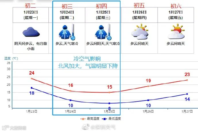 初二夜间到初四(23日夜间-25日)受中等强度冷空气影响,渐转多云,气温下降5-6℃; -
