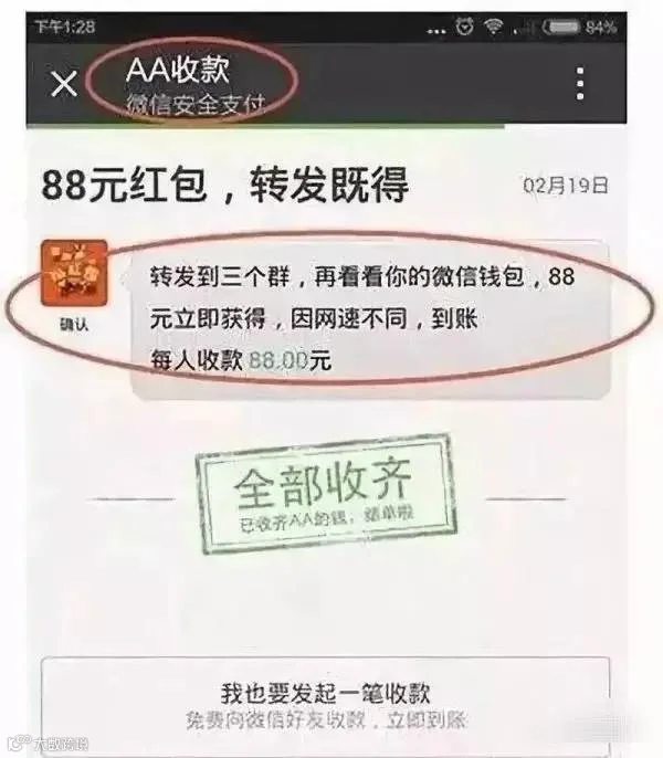 警惕写着“送钱”“现金礼包”“AA红包”等字样的红包骗局。此类红包往往对微信AA收款界面进行略微改动,加上“送钱”“现金礼包”等字样,让用户误以为输入密码是在领红包,但实际上却是给对方转账 。