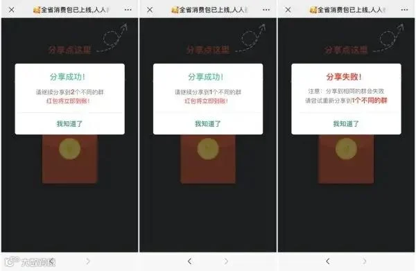 在点击此类红包后,页面提示需要转到其他微信群或分享到朋友圈才能领取。利用微信好友链进行传播,让用户大大降低了警惕,很多人出于对好友的信任,点击后继续分享给其他好友。加上红包流程繁琐,让很多人不愿意“前功尽弃”,造成恶性循环,传播量极广。