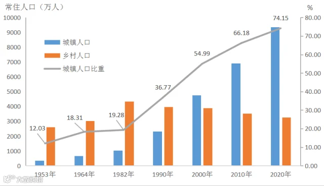 从城乡人口看,全省城镇人口为9344万人,占常住人口的74.15%,比2010年提高7.97个百分点。