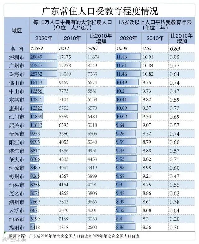 除去广深,珠海是最有文化的城市。从常住人口的受教育程度看,深圳、广州、珠海位列前三,且优势明显,每10万人口中拥有的大学(指大专及以上)文化程度的人口分别为28849人、27277人和25752人,15岁及以上人口平均受教育年限分别为11.86年、11.61年和11.46年。