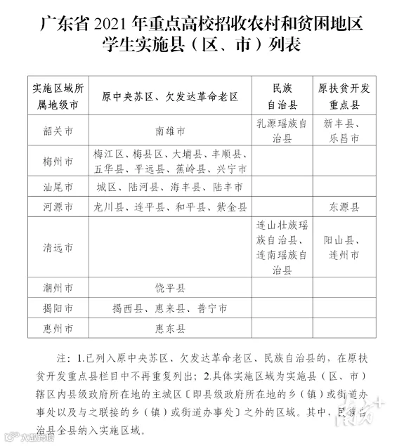 今年起,广东实施“高校专项计划”和“地方专项计划”的范围仍为原中央苏区县、欠发达革命老区县、少数民族自治县及我省原扶贫开发重点县。实施范围共有30个县(区、市),分布在韶关、梅州、汕尾、河源、清远、潮州、揭阳、惠州。