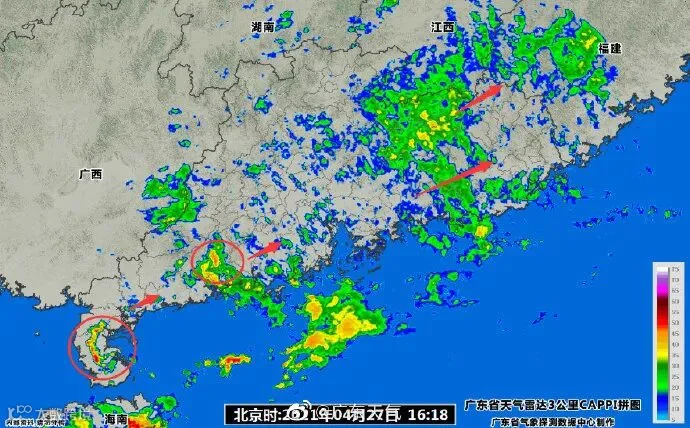 粤北、粤西、珠江三角洲市县有大雨到暴雨局部大暴雨,部分地方伴有短时强降雨和7级左右雷雨大风等强对流天气;粤东有中到大雨局部暴雨。