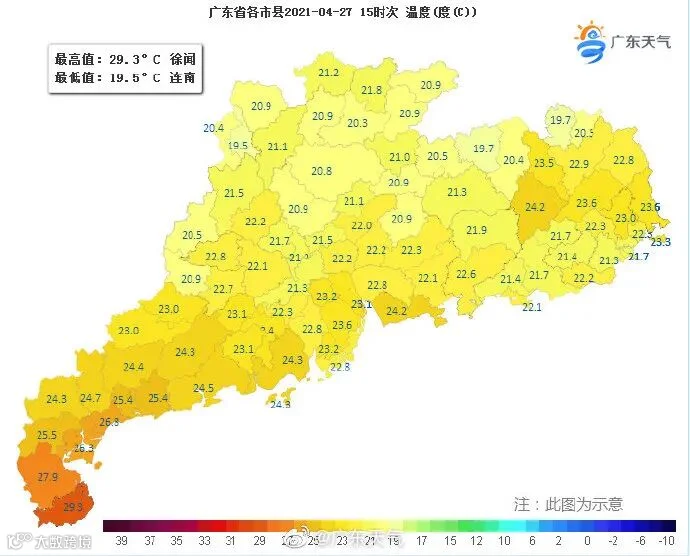 粤西和珠江三角洲市县25℃~27℃,其余市县22℃~24℃。