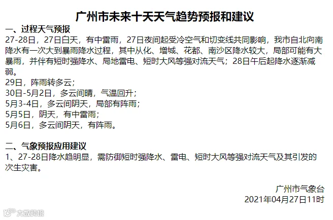27-28日,27日白天,有中雷雨,27日夜间起受冷空气和切变线共同影响,我市自北向南降水有一次大到暴雨降水过程,其中从化、增城、花都、南沙区降水较大,局部可能有大暴雨,并伴有短时强降水、局地雷电、短时大风等强对流天气;28日午后起降水逐渐减弱。