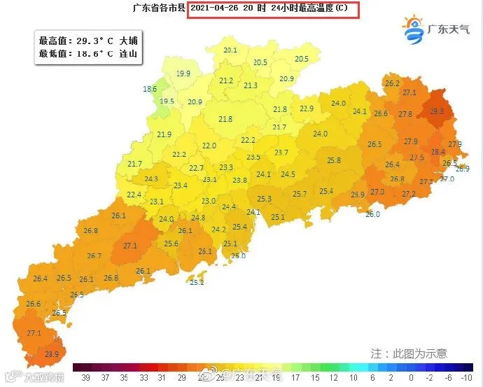 粤北偏北市县23℃~24℃,其余市县25℃~26℃。