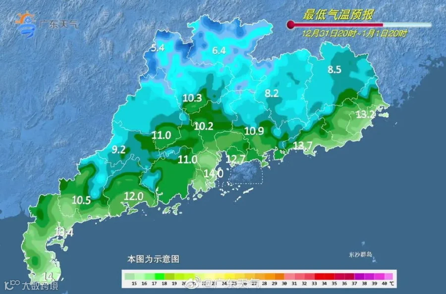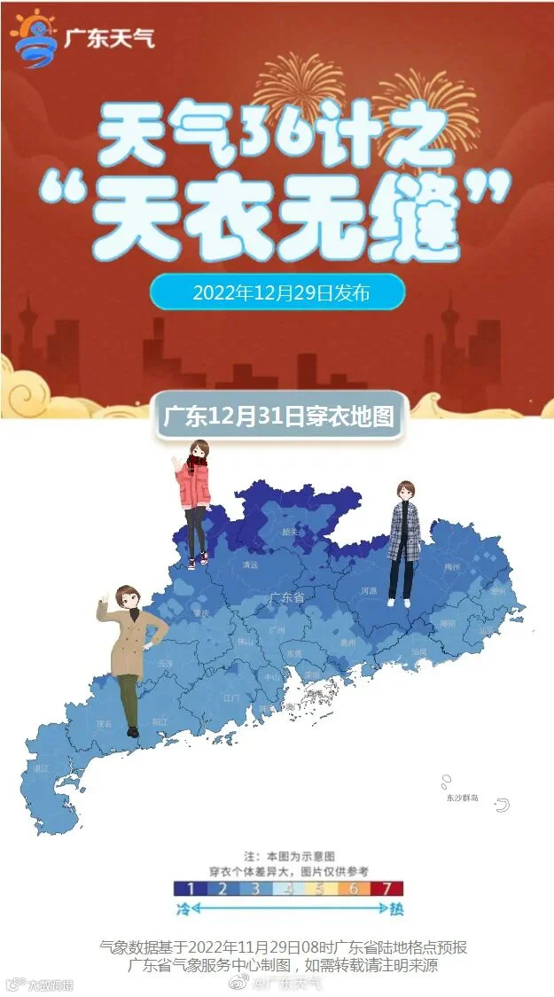 31日,全省晴间多云。最低气温:粤北2℃~5℃,其中高海拔山区零下2℃~1℃,有霜(冰)冻,南部沿海市县9℃~12℃,其余市县6℃~8℃。