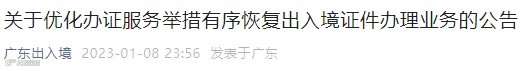 《公告》称,根据国家移民管理局关于从2023年1月8日起新型冠状病毒感染“乙类乙管”后优化移民管理政策措施的公告,广东公安出入境管理部门有序恢复受理审批中国公民因出国旅游、访友申请普通护照;恢复办理本省户籍居民或居住证持有人赴港旅游签注;恢复受理审批外国人申请普通签证延期、换发、补发,停留证件签发、换发、补发,居留证件签发、延期、换发、补发。