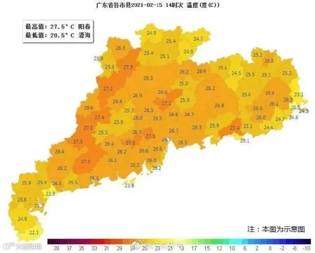 昨日(2月15日)14时全省都在20℃以上,