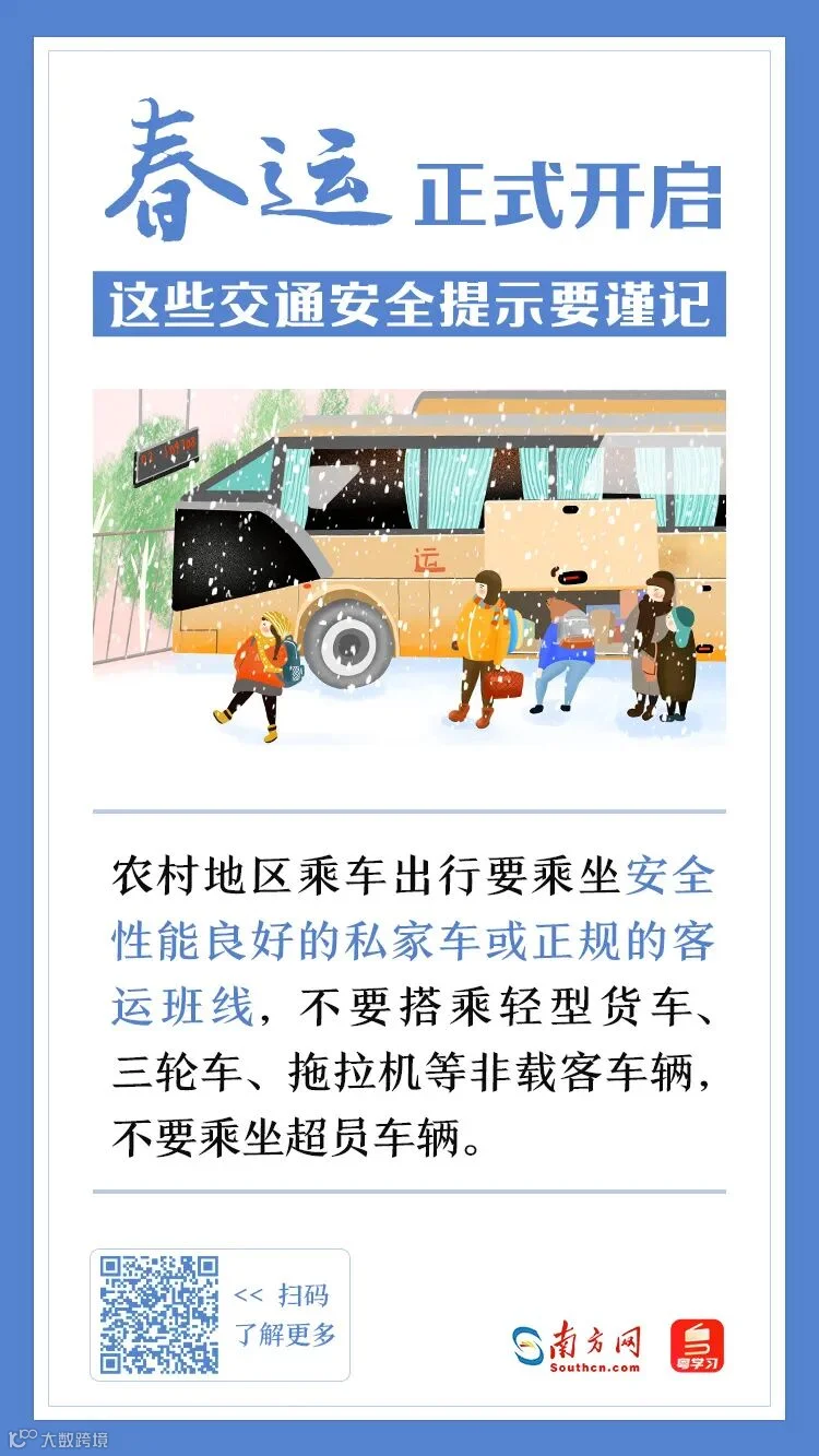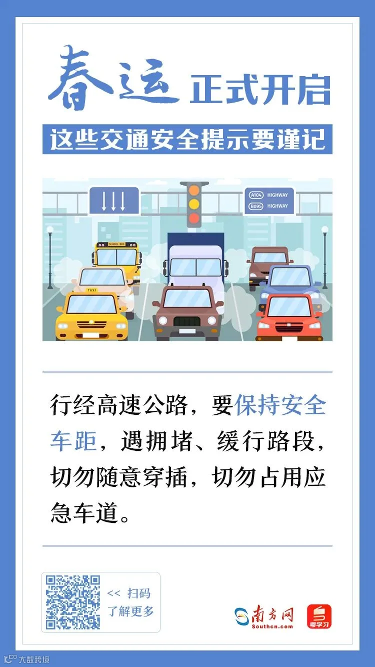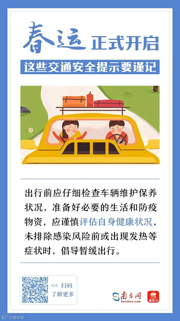 据介绍,2023年春运广东全省旅客发送量预计将达到1.06亿人次,同比2022年增长7.4%。其中道路运输预计约有7000万人次,同比增长3.98%。与此同时,今年春运将严格落实公众出行优化保障的政策,执行新冠病毒感染“乙类乙管”政策和疫情防控新十条措施,不再对乘客查验核酸检测阴性证明和健康码,不再开展落地检,不再实施乘客测温,不随意暂停客流服务。