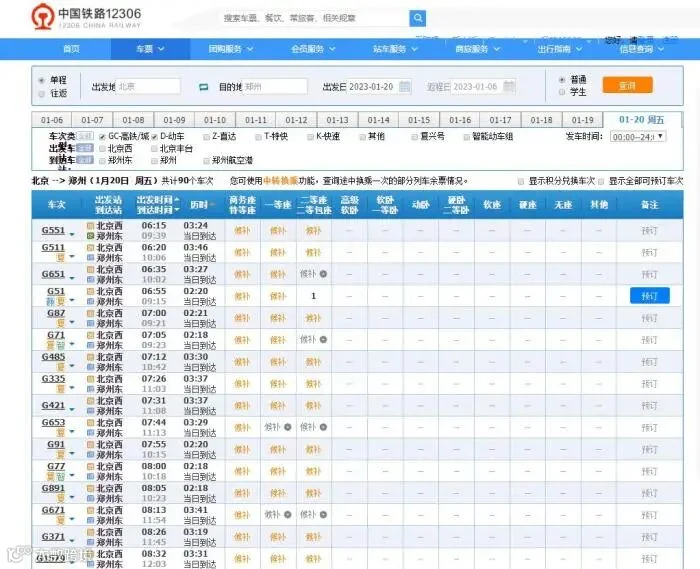 1月6日下午,记者查询12306网站发现,不少热门线路的火车票已经售罄。如,1月20日(腊月二十九)当天北京至郑州的高铁/动车车票只剩极少数车次还有余票,商务座、一等座也被抢购一空,K字头、Z字头等列车车票也几乎售罄;北京至武汉的高铁/动车余票也所剩无几。