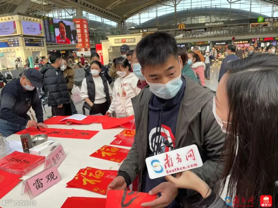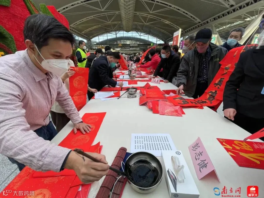 今早记者发现,在广州南站现场设置了不少活动,包括地铁博物馆展览和写春联服务。不少乘客围在春联活动周围,挑选自己喜欢的春联内容,让书法老师帮忙挥毫泼墨,将广州的祝福带回家。