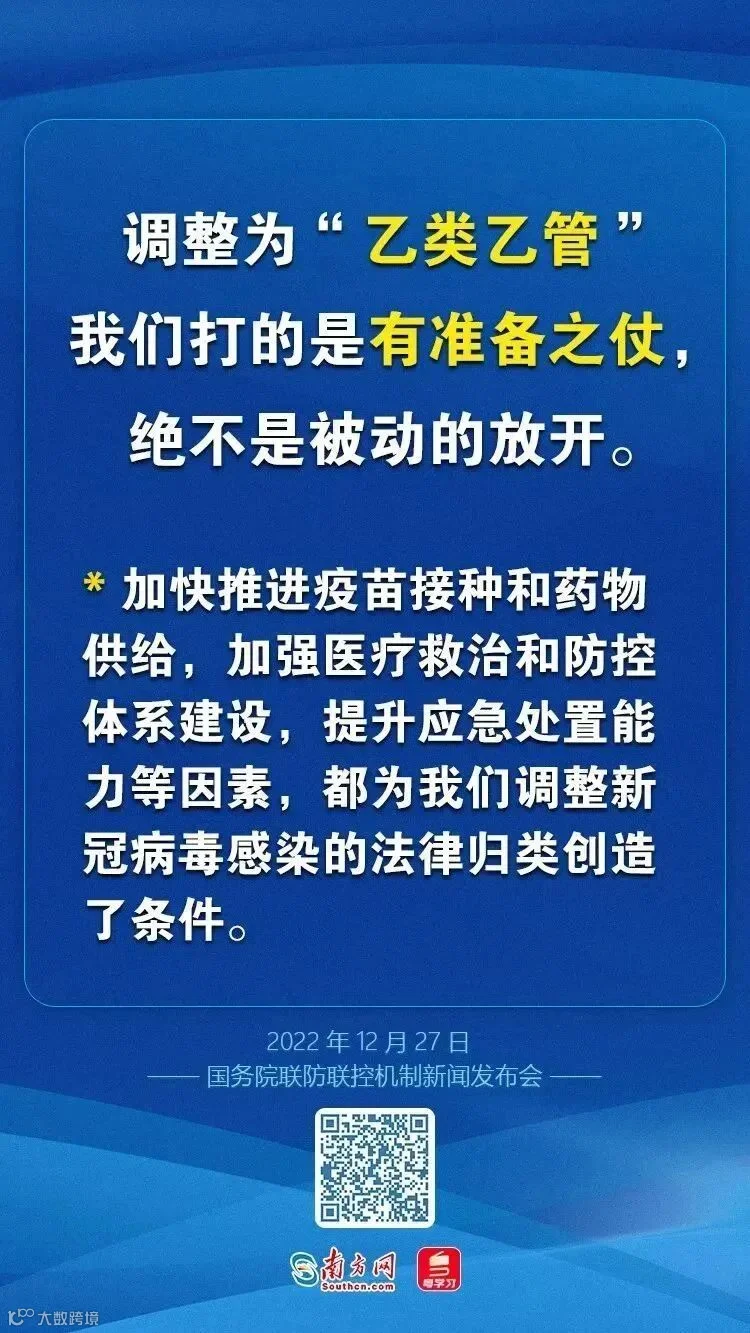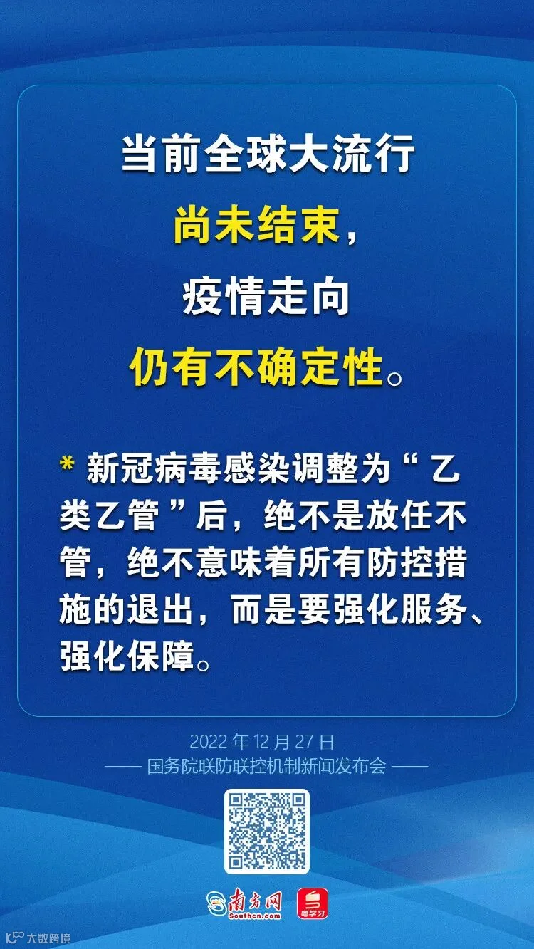 12月27日下午3点,国务院联防联控机制召开新闻发布会,国家卫生健康委、国家疾控局相关负责同志和有关专家出席发布会,介绍新冠病毒感染实施“乙类乙管”措施有关情况。