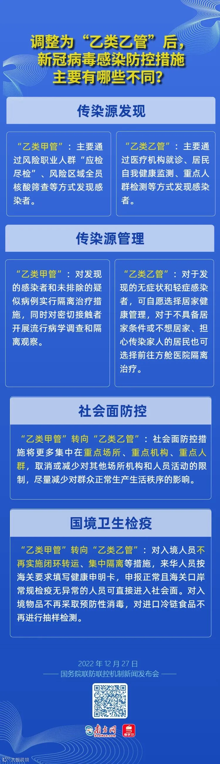 三是在社会面防控方面,从“乙类甲管”调整为“乙类乙管”后,社会面防控措施将更多集中在重点场所、重点机构、重点人群,取消或减少对其他场所机构和人员活动的限制,尽量减少对群众正常生产生活秩序的影响。比如除养老机构、社会福利机构等特殊场所,不再查验核酸检测阴性证明;不再对跨区域人员开展落地检、不再对外溢风险人员开展跨区域协查;不再划定高、低风险区,不再采取高风险区“足不出户、上门服务”等相应的风险区域管控措施。 -