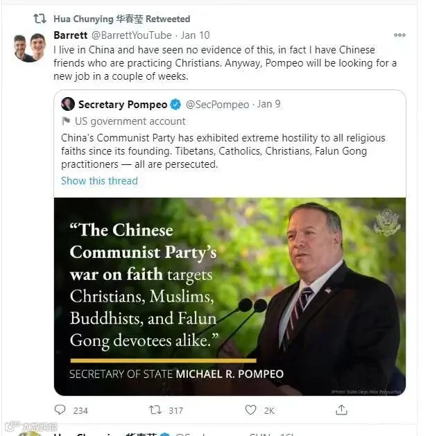 近日,我国外交部发言人华春莹和赵立坚转发了一位外国网友(@BarretYouTube)的推文。针对美国国务卿蓬佩奥在Twitter上关于中国对待宗教信仰的评论,这位网友回复说,“我就生活在中国,从来没有看到相关事实依据。事实上,我就有信基督教的中国朋友。”