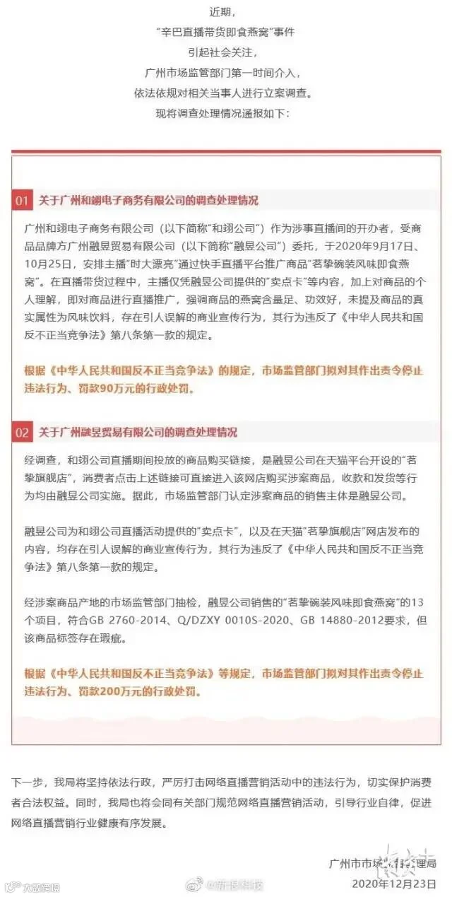 12月23日,广州市市场监管局公布“辛巴带货燕窝”处理结果,辛巴旗下广州和翊电子商务有限公司,因违反《中华人民共和国反不正当竞争法》被罚款90万元。快手平台随即跟进,宣布辛巴个人账号官方封停60天,辛巴家族等27名电商主播封停账号15天。