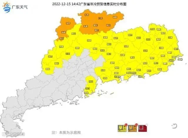 过程最低温度:出现在19日早晨,粤北零下3℃~1℃(高寒山区零下5℃~零下3℃),广州市区2℃~4℃。