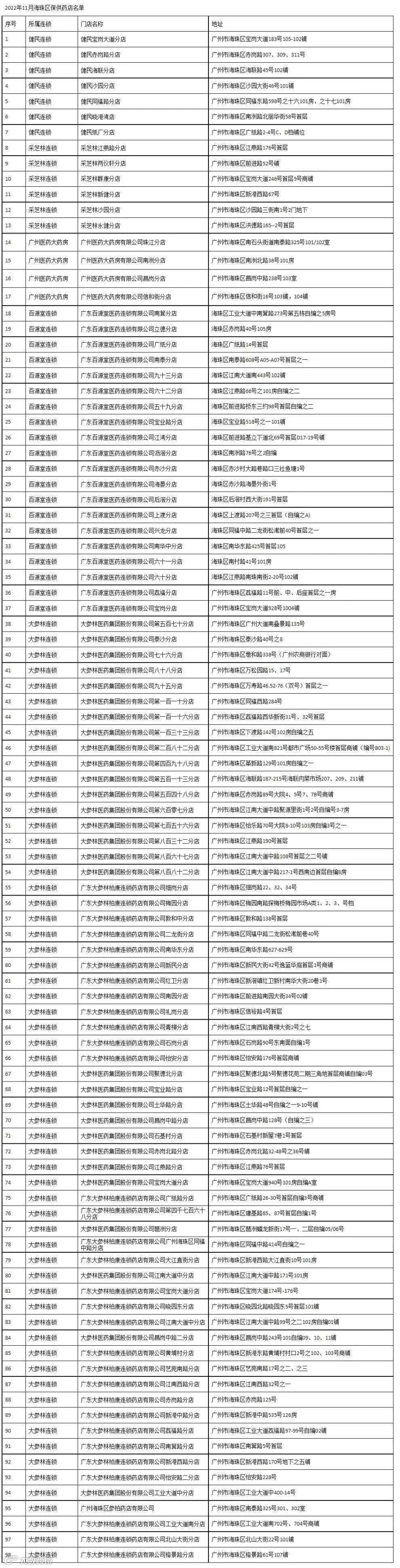 答:广州市市场监管局和海珠区市场监管局紧急协调广药集团和大参林集团,目前两家药业集团旗下的98家保供药店均正常营业,承担11月5日至11月7日这3天内的药品保供任务,海珠区辖区内有用药需求的市民朋友,可前往保供药店购药。如有困难或特殊情况,请及时联系社区工作人员。