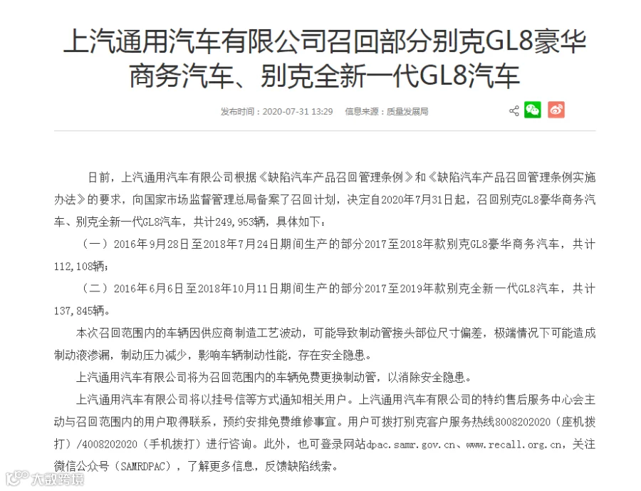 自2020年7月31日起,召回别克GL8豪华商务汽车、别克全新一代GL8汽车,共计249953辆