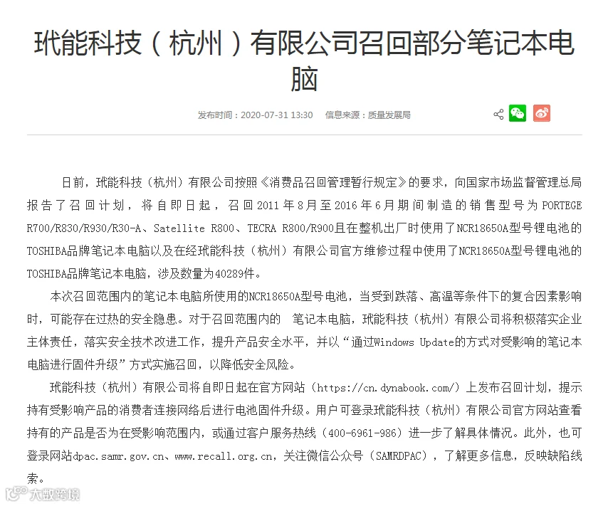 召回2011年8月至2016年6月期间制造的销售型号为PORTEGE R700/R830/R930/R30-A、Satellite R800、TECRA R800/R900且在整机出厂时使用了NCR18650A型号锂电池的TOSHIBA品牌笔记本电脑以及在经玳能科技(杭州)有限公司官方维修过程中使用了NCR18650A型号锂电池的TOSHIBA品牌笔记本电脑,涉及数量为40289件。