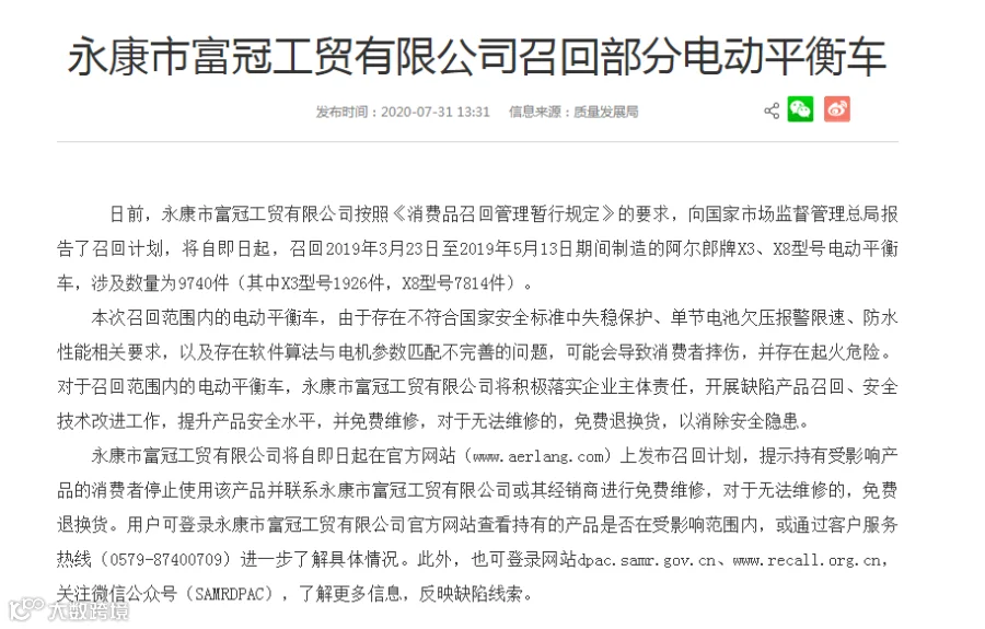 召回2019年3月23日至2019年5月13日期间制造的阿尔郎牌X3、X8型号电动平衡车,涉及数量为9740件(其中X3型号1926件,X8型号7814件)。