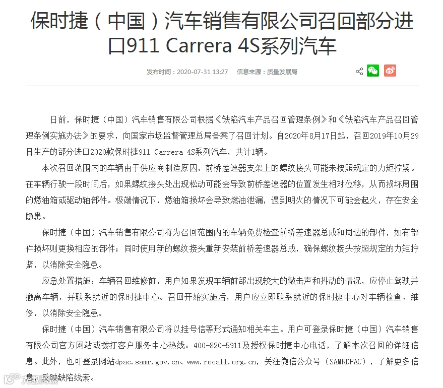 日前,保时捷(中国)汽车销售有限公司根据《缺陷汽车产品召回管理条例》和《缺陷汽车产品召回管理条例实施办法》的要求,向国家市场监督管理总局备案了召回计划。
