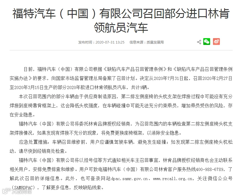决定从2020年7月31日起,召回2020年2月27日至2020年3月15日生产的部分2020年款进口林肯领航员汽车,共计9辆。
